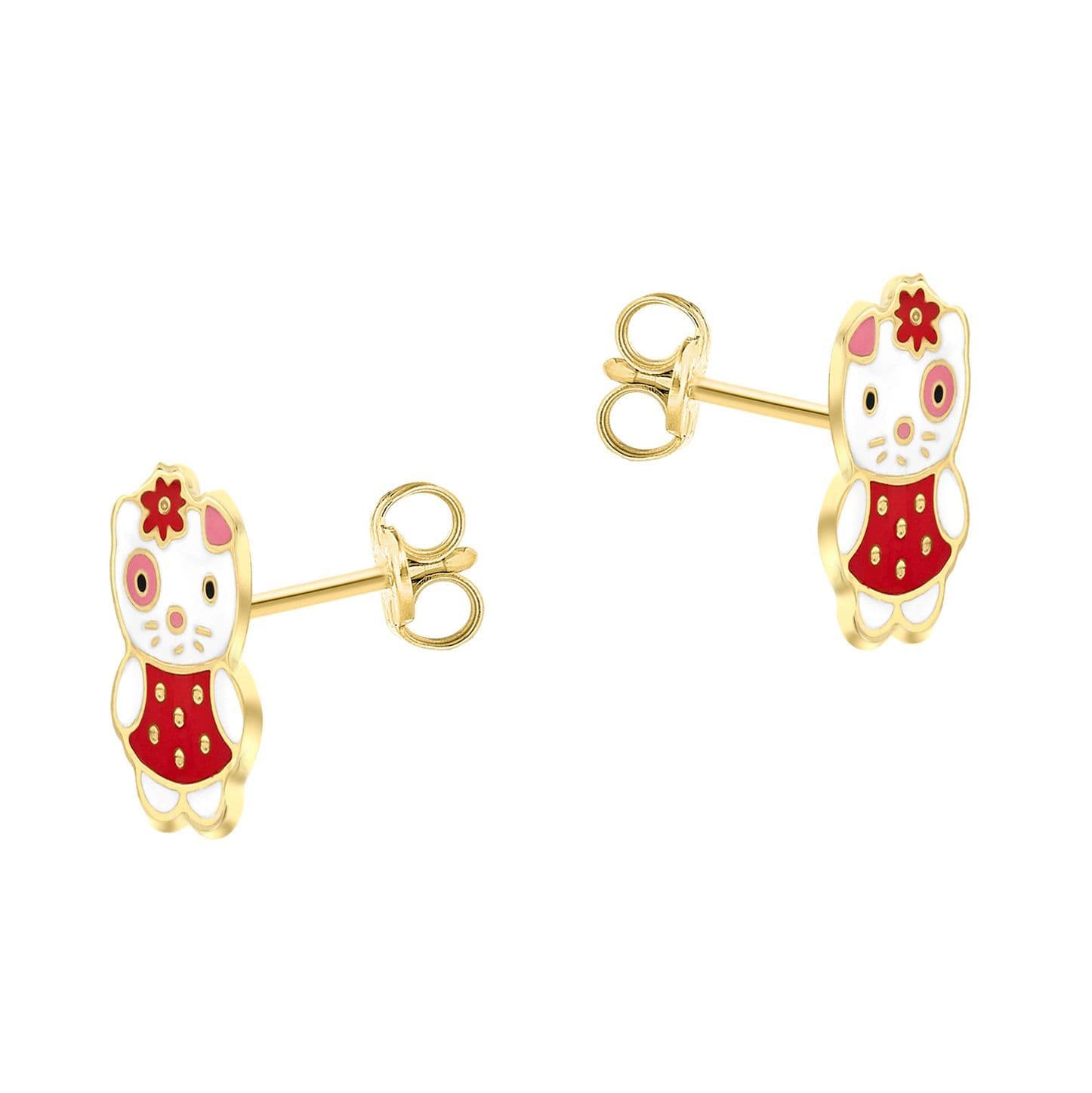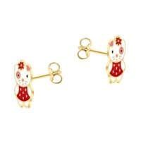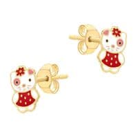 Children's 9ct Yellow Gold 5mm x 8mm Red and White Enamel Kitty Stud Earrings